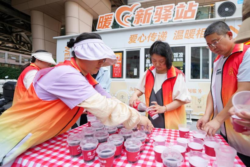 6月25日,在北京市东城区崇外街谈一处“暖新驿站”外,街谈使命主谈主员(右)为又名外卖员奉上冰镇饮料。新华社记者 鞠焕宗 摄