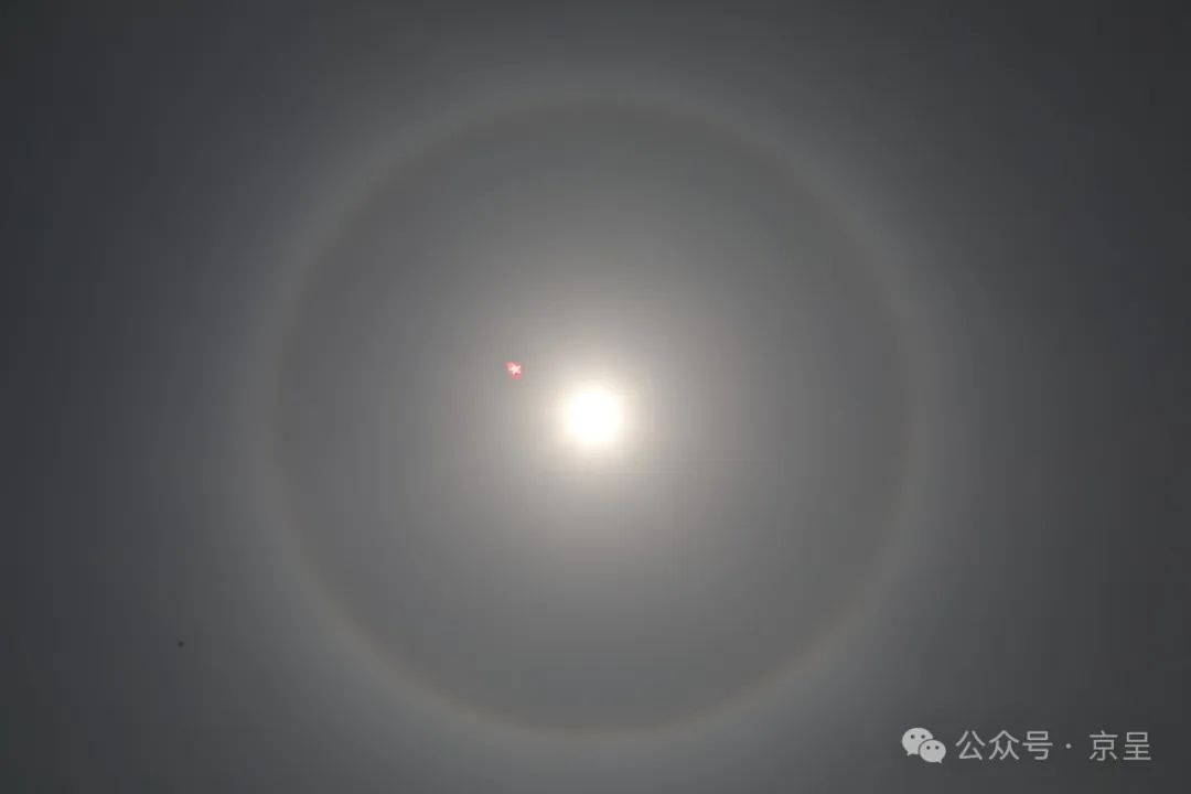 “京城拍客”拍摄下多幅日晕像片。看,其中一幅像片里,光环里还有一颗小小的“五角星”——原本是一只印有五角星的风筝。