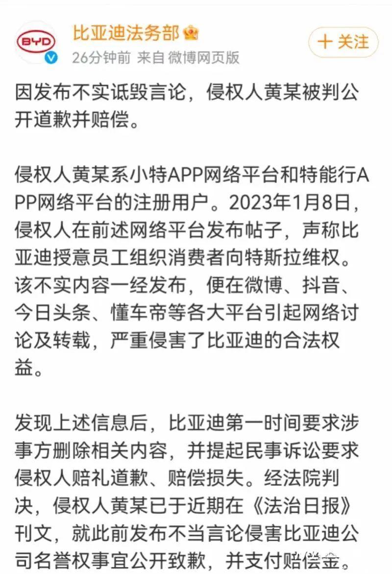 4月30日晚,“比亚迪法务部”发文称,因发布演叨乱骂言论,侵权东说念主黄某被判公开说念歉并补偿。