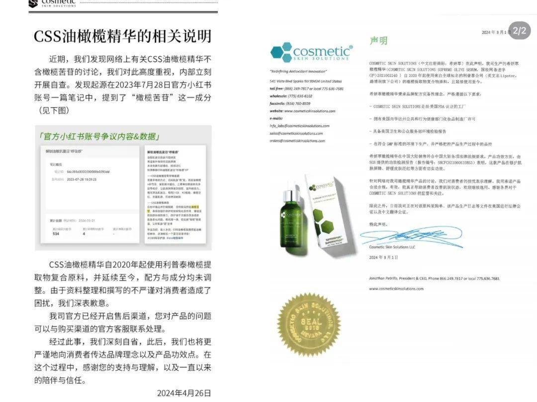 “CSS油橄榄事件”引起争议后,CSS希妍萃品牌分别于本年3月、4月在抖音和小红书等官方账号发布了两则声明,称该事件由于尊府整理和撰写的不严谨所致,尔后再无关联回复。