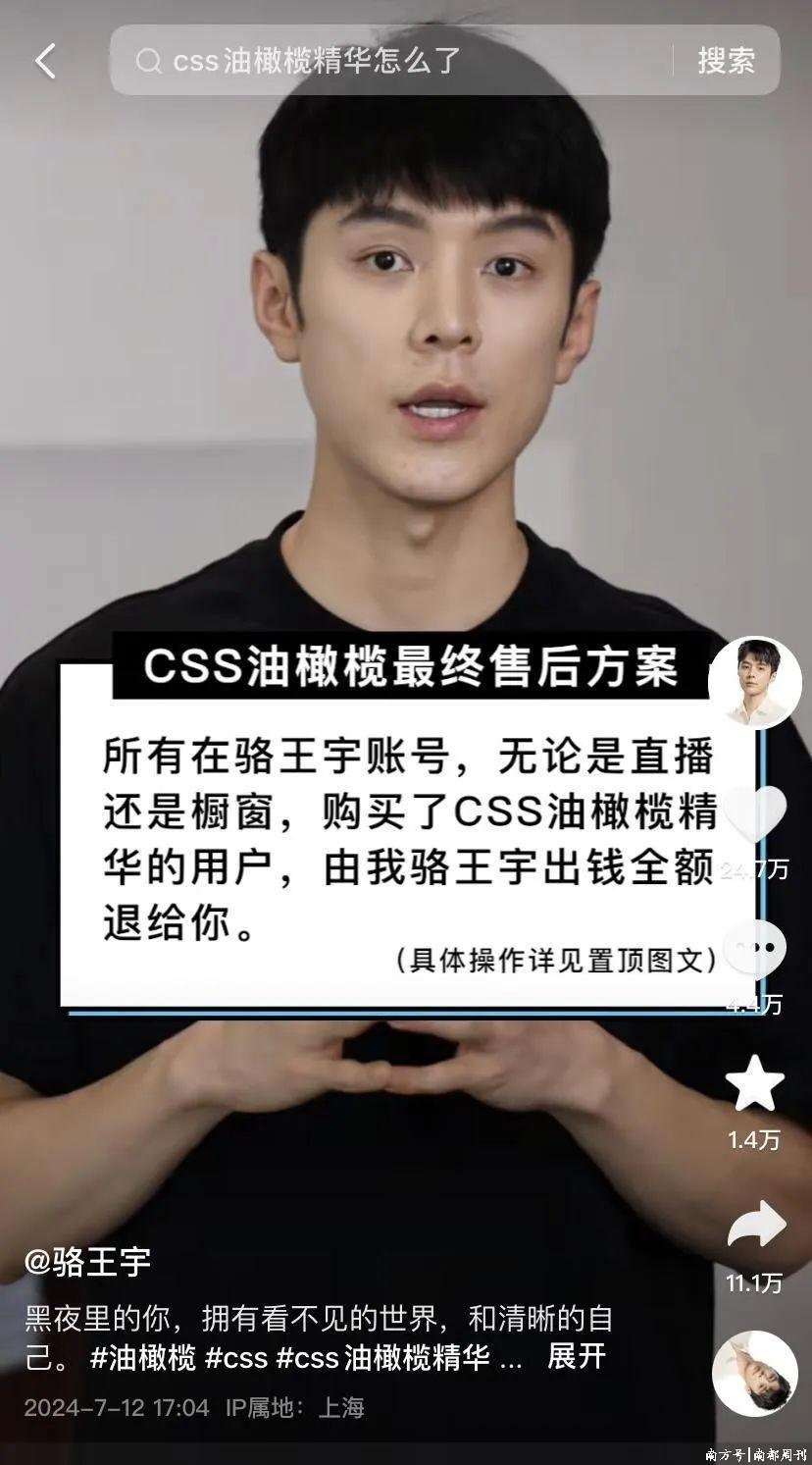 此前,曾为该品牌油橄榄精华带货的“抖音好意思妆一哥”骆王宇曾被推优势口浪尖。骆王宇发布视频证明称,由于品牌不肯意退款,其个东说念主将和配合机构共同为在其账号购买了“CSS油橄榄精华”的用户退款,触及金额达1.5亿元。
