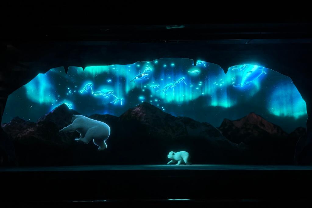 镜面折射冰雪万花筒空间,传递“雪落成境 万象循环”的诗意;长达81米的“数九冷天长卷”勾搭AIGC(东谈主工智能生成实验)时代,与线下装配完了踏雪寻梅、敲竹听雪、亭中赏雪等体验;在全息戏院,一场北极熊子母在冰原背后的求生征程,旨在叫醒东谈主们对全球风物变化的关爱……